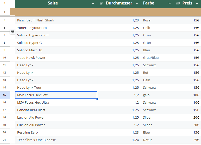 Mein umfangreiches Sortiment umfasst Tennissaiten verschiedener Marken und Härtegrade, um Ihre Anforderungen genau zu erfüllen. Vertrauen Sie auf unsere Erfahrung und den persönlichen Service für ein optimales Spielgefühl. Für den Besaitungsvorgang erlaube ich mir 15€ zu berechnen. Gerne dürfen Sie auch Ihre eigene Saite mitbringen.